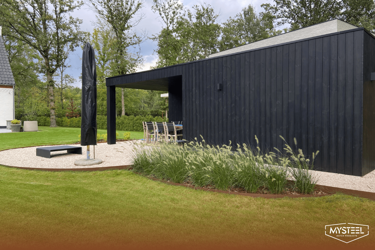 Rubnici pomažu u definiranju i naglašavanju različitih dijelova vrta. Pružaju jasne granice i ističu podjelu različitih zona vašeg vrta. U donjoj slici, rubnik od Corten čelika je također kombiniran s saksijom od čelika corten.