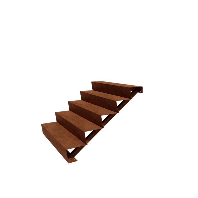 Materijal Ove stube su izrađene od visokokvalitetne Corten-A čelične ploče. Ova vrsta metala ima jedinstvenu osobinu da stvara vrlo gustu oksidnu kožicu (sloj hrđe). Potpuno prohrđavanje je stoga nemoguće. Zbog guste oksidne kožice, dublje ležeći materijal je zaštićen od kisika, što značajno usporava oksidaciju dok se korozija nastavlja. Kovane stube se isporučuju bez hrđe, u sivoj boji metala. Proces hrđanja počinje u prvih 2 mjeseca, za to nije potrebna nikakva obrada. Tijekom procesa hrđanja, stepenu se može ostaviti trag. Corten čelik je legura metala koja se sastoji od željeza, a u njega su dodani bakar, fosfor, silicij, nikal i krom.